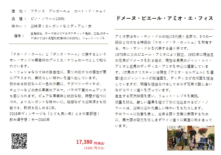 アミオ家はモレ・サン・ドニの地に5代続く名家で、5つの一級畑と偉大なる特級畑「クロ・ド・ラ・ロッシュ」を所有する、モレ・サン・ドニを代表する造り手です。