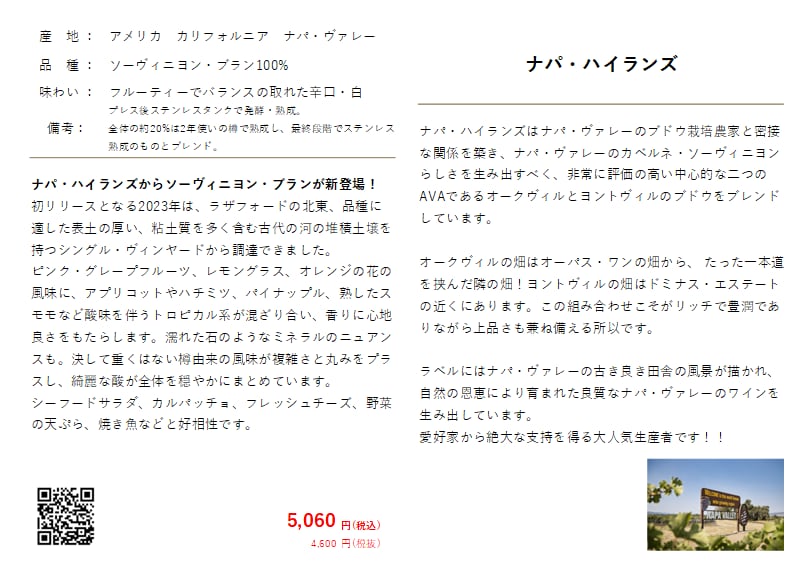 ナパ・ハイランズからソーヴィニヨン・ブランが新登場!!