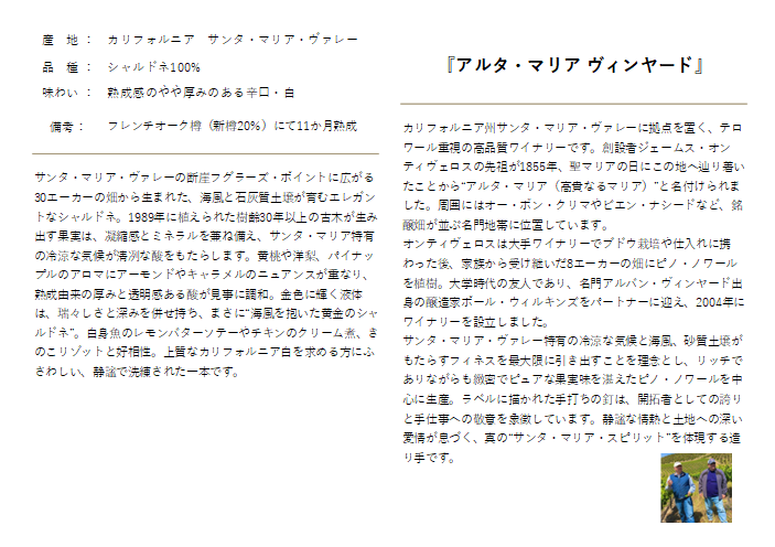 アルタ・マリアのシャルドネ2015年を手にしたとき、「白ワインの旅に出たくなる1本だなぁ」と感じました。