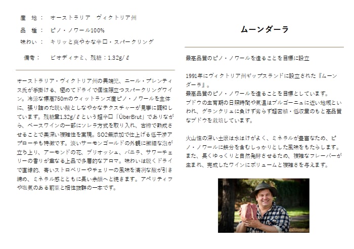 オーストラリア・ヴィクトリア州の異端児、ニール・プレンティス氏が手掛ける、極めてドライで個性的なスパークリングワインです。