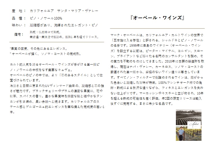 マーク・オーベールが手掛けるカリフォルニア・カルトの五本指に入る希少なシャルドネ&ピノ・ノワール。オーベールの設立は1999年。