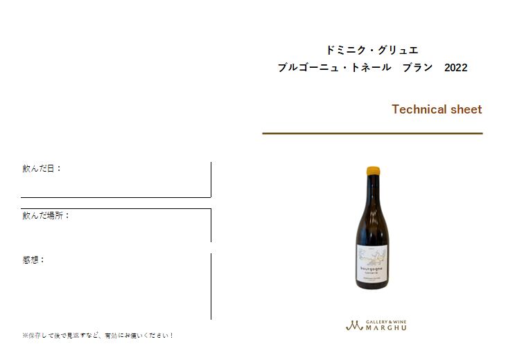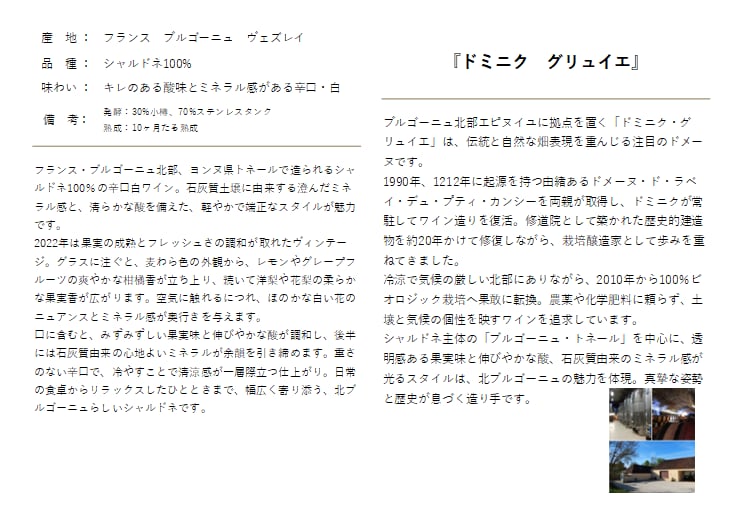 この『ドミニク・グリュエ ブルゴーニュ・トネール ブラン 2022』は、透明感ある味わいと自然なフルーツ感が魅力の辛口白です。
