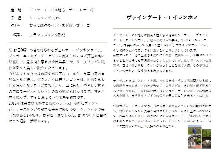 ドイツ・モーゼル地方に拠点を置く『ヴァイングート・モイレンホフ』が造る、伝統的なスタイルのリースリングです。