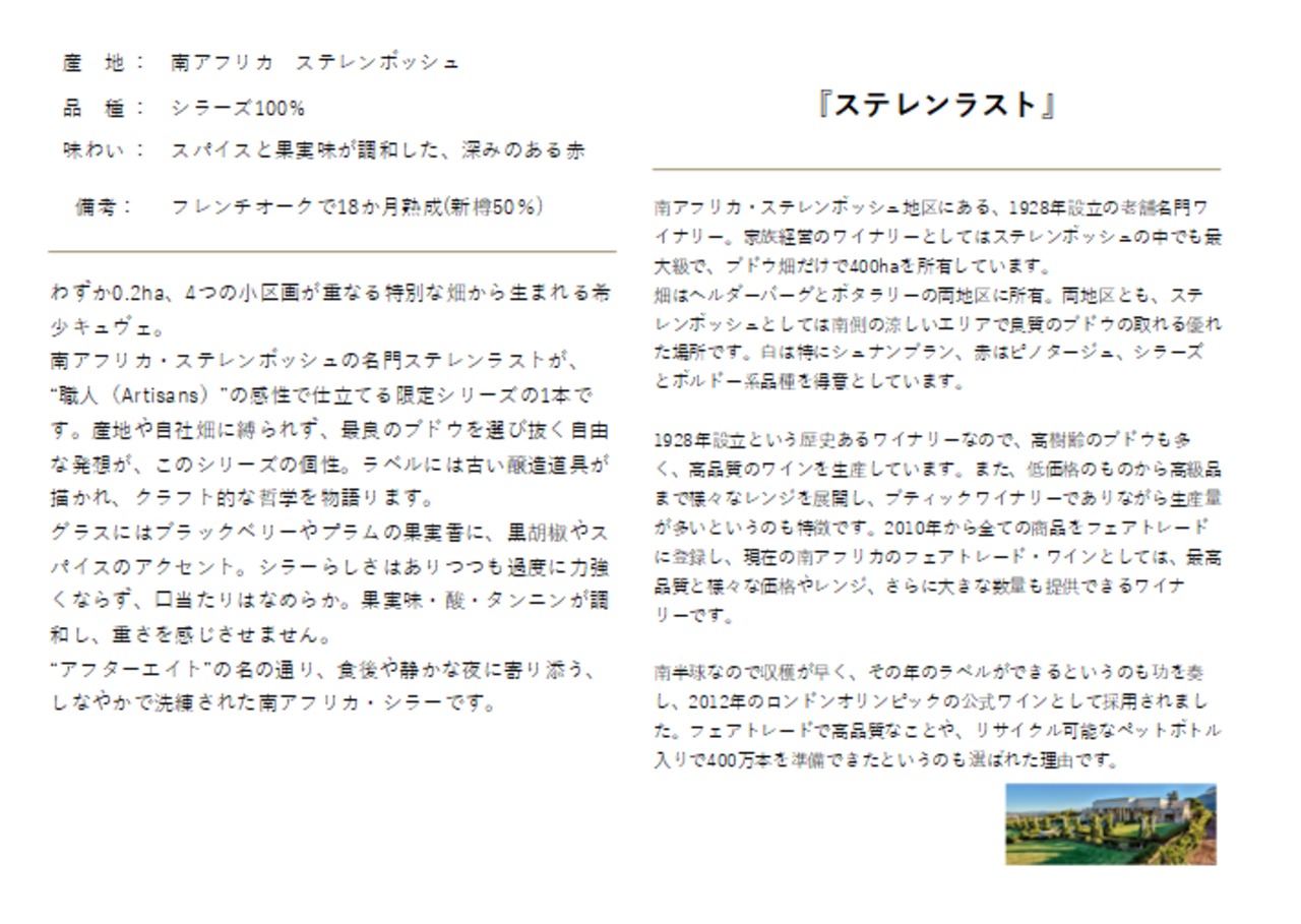 南アフリカを代表する銘醸地ステレンボッシュに拠点を構える老舗ワイナリー、ステレンラストが手がける赤ワインです。