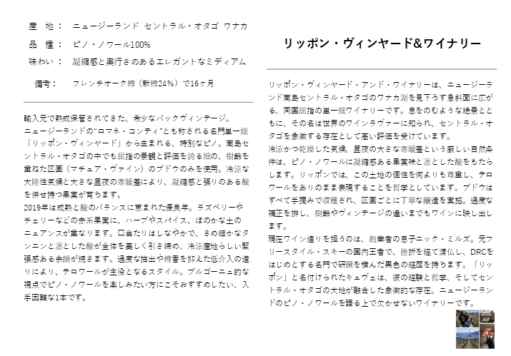 「リッポン」という名前を冠したキュヴェは、ワイナリーの哲学を象徴する存在であり、セントラル・オタゴのテロワールを理解するうえで欠かせないワインとされています。