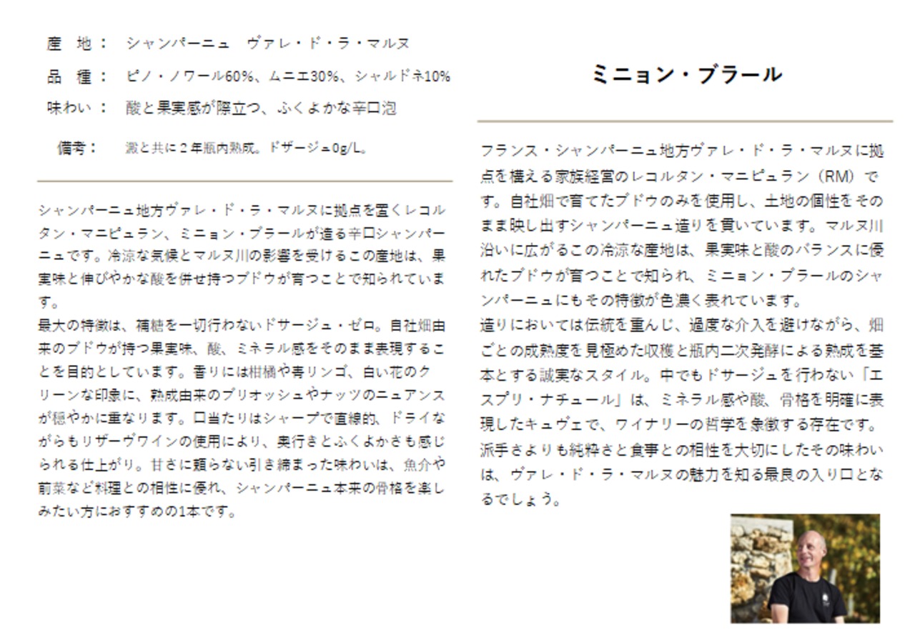 「ミニョン・ブラール エスプリ・ナチュール ドサージュ・ゼロ」は、フランス・シャンパーニュ地方ヴァレ・ド・ラ・マルヌに本拠を置くレコルタン・マニピュラン(RM)、「ミニョン・ブラール」が造る“ドサージュ・ゼロ”のシャンパーニュです。