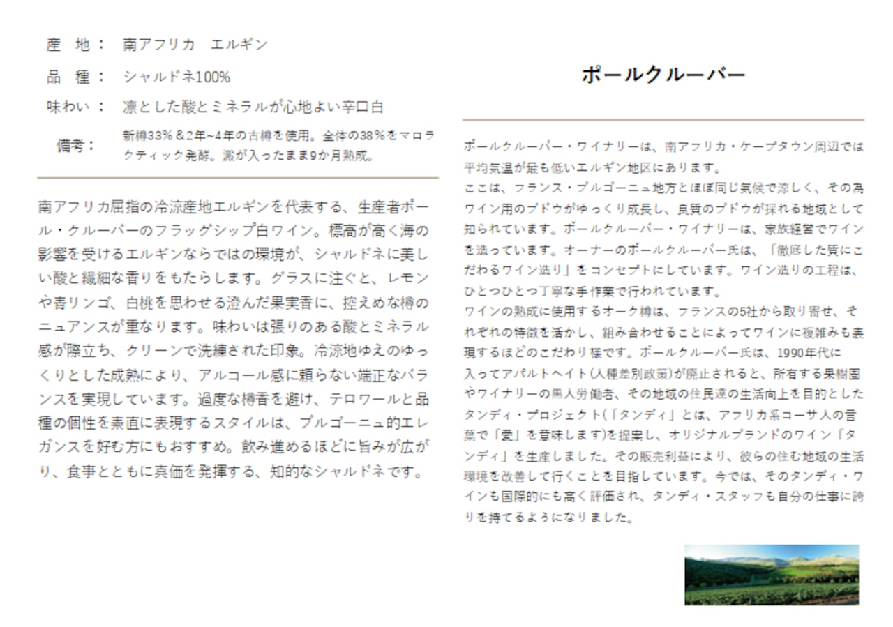 「ポールクルーバー・エステート・シャルドネ」は、南アフリカ屈指の冷涼産地エルギンを代表するシャルドネです。