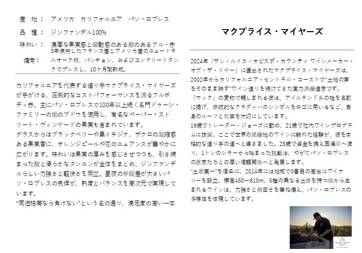 アメリカ・カリフォルニアを代表する人気生産者『マクプライス・マイヤーズ』が手掛けるフルボディ赤ワインです。
