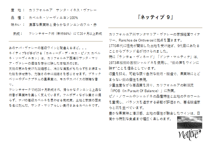 ネイティブ9の「カニャーダ・デ・ロス・ピノス カベルネ・ソーヴィニヨン」は、アメリカ西海岸の名産地**サンタ・マリア・ヴァレー(Santa Maria Valley)**で育まれた濃厚フルボディ赤ワインです。