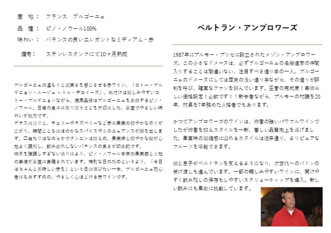 毎日の食卓に自然と馴染むブルゴーニュの赤として、ぜひ一度お試しください。