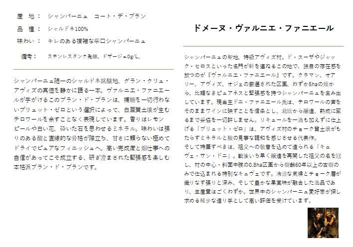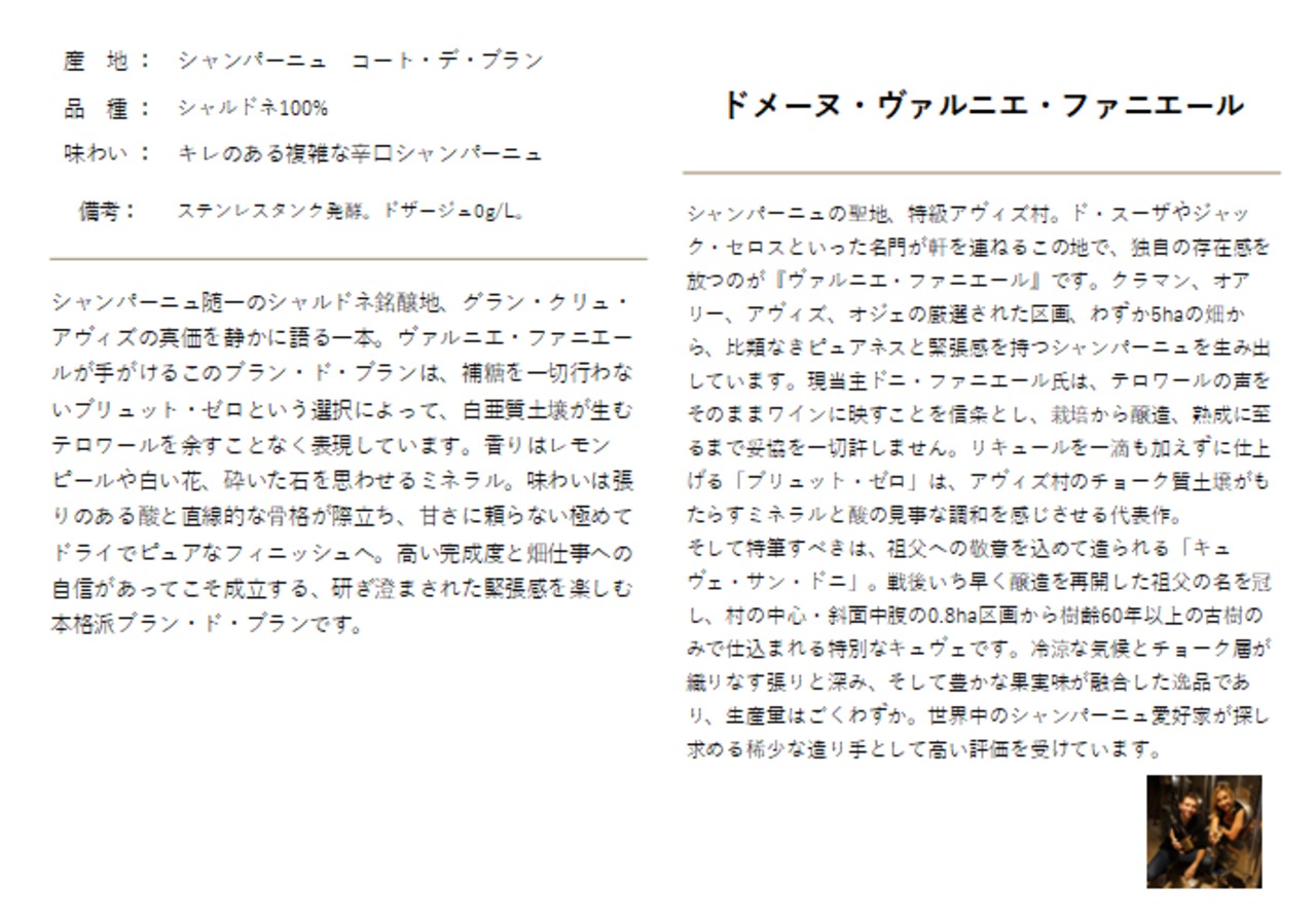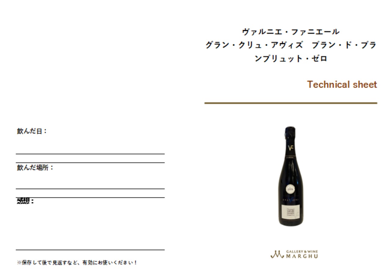 この「ヴァルニエ・ファニエール グラン・クリュ・アヴィズ ブラン・ド・ブラン ブリュット・ゼロ」は、シャンパーニュ地方屈指のシャルドネ銘醸地として知られるアヴィズ村(Avize)のグラン・クリュ区画から生まれる、