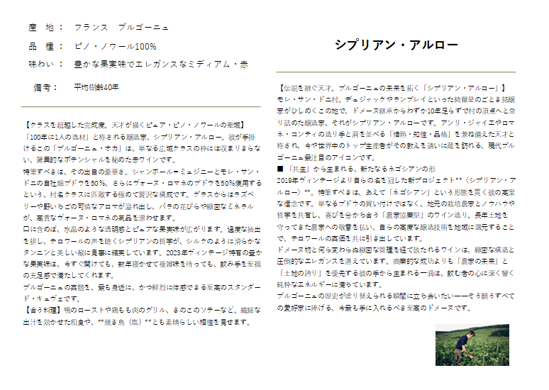 ブルゴーニュの若手生産者の中でも、シプリアン・アルローは非常に注目されている造り手の一人です。