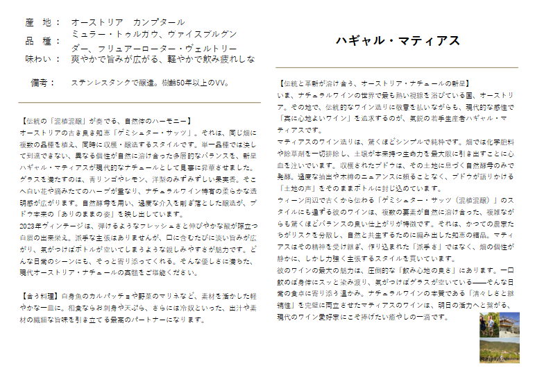 ハギャル・マティアスは、オーストリアで注目を集める若手生産者の一人であり、伝統と革新を融合させたワイン造りを実践しています。