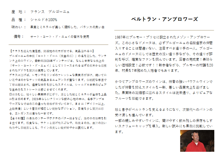 ベルトラン・アンブロワーズが手掛ける「ブルゴーニュ コート・ドール ブラン」は、ブルゴーニュの中核であるコート・ドールのブドウを使用した、ワンランク上の白ワインです。