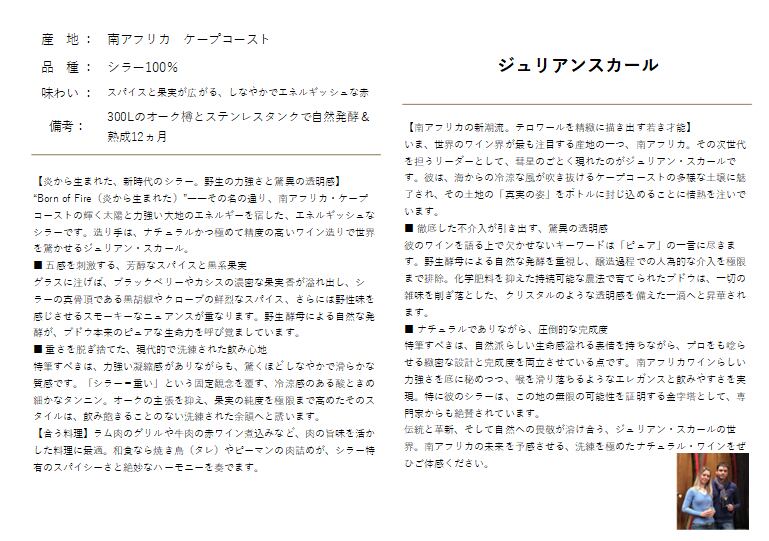 特にシラーにおいては、南アフリカの可能性を示す重要な品種とされており、ジュリアン・スカールのワインはその魅力を非常に分かりやすく表現しています。