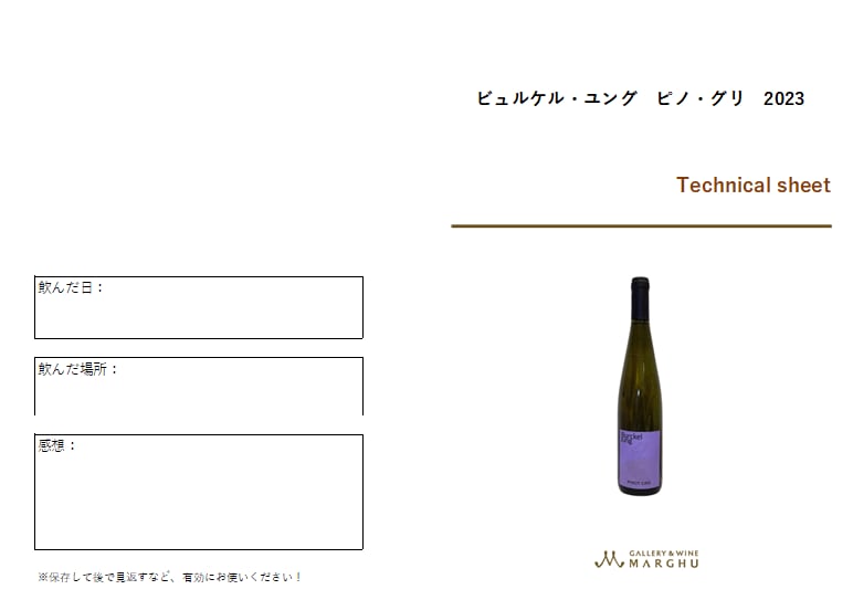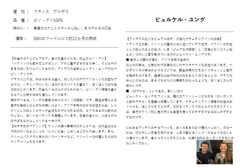 「ビュルケル・ユング ピノ・グリ」は、フランス・アルザス地方で造られる、果実の厚みとミネラルが美しく調和した白ワインです。