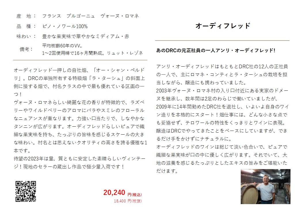 オーディフレッドらしいピュアで繊細な果実味を持ち、たっぷりの旨味を感じるスケールの大きな味わい。