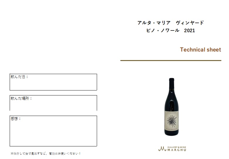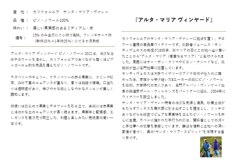 アルタ・マリア ヴィンヤード ピノ・ノワール 2021 は、カリフォルニアの中でも冷涼な気候条件を活かし、“果実のピュアさ・酸の美しさ・エレガンス”を追求したクラシックスタイルのピノ・ノワールです。