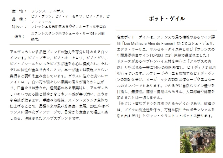 このように、ボット・ゲイルのメティスは、アルザスらしい透明感、品種間のハーモニー、繊細かつバランスの良さが魅力の1本です。