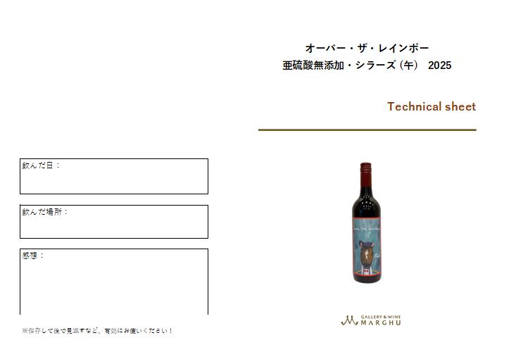 オーバー・ザ・レインボー 亜硫酸無添加・シラーズ(午)2025 は、オーストラリアの太陽と大地の力を素直に映した、亜硫酸無添加でありながら、コクと飲みごたえを備えた赤ワイン です。