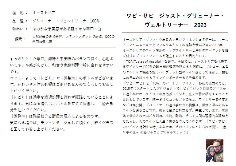 「ワビ・サビ」は「TOA」のパートナーワイナリー各社の協力のもと、2015年にスタートしたプロジェクトで、ビオロジック栽培のブドウから造られたオーストリアの自然派ワインを、広く世界に紹介することを目的としています。